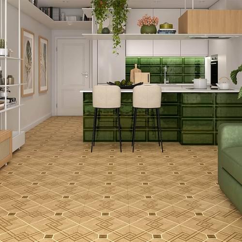 Piso cerámico de diseño geométrico en formato 36*36 cm, ideal para interiores como cocinas, salas, comedor y recamaras.
